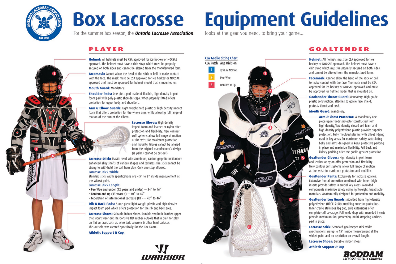 - Equipment requirements: Full Lacrosse Equipment is mandatory (OLA Box Lacrosse Equipment Guidelines)